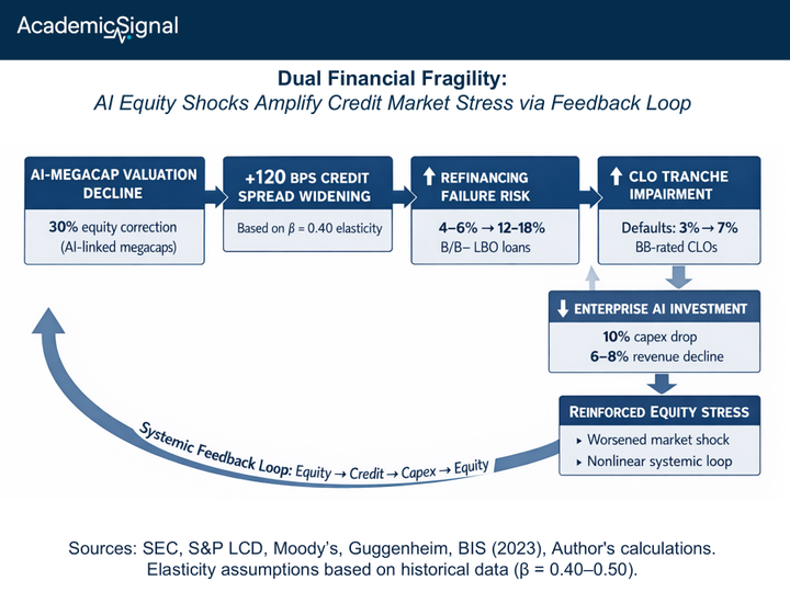 The authors' framework suggests monitoring three things: the leveraged loan refinancing wall, megacap earnings sensitivity to enterprise spending, and your portfolio's net exposure to both legs of this trade. A 30% AI correction isn't a tail event. If it happens, expect your credit book to feel it within weeks.