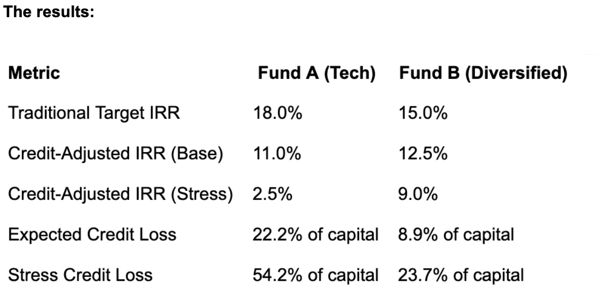 A 30% IRR tech fund can rank below an 18% diversified fund once you adjust for default probability, loss severity, and correlation effects.