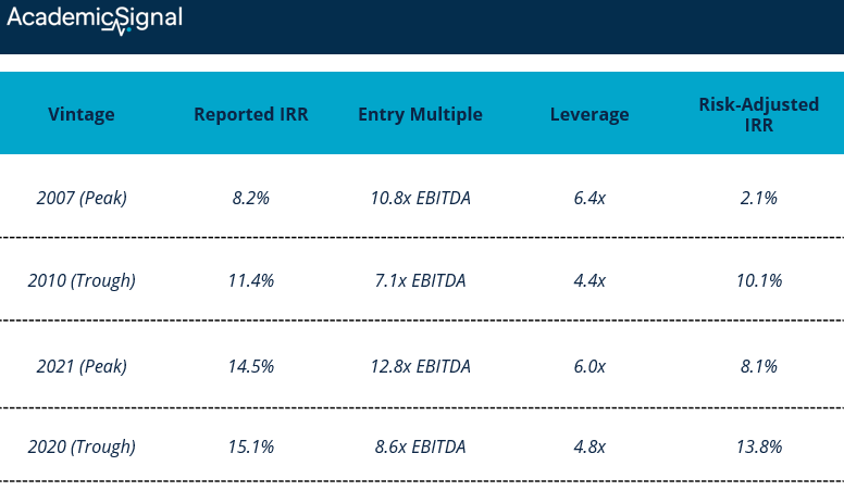 Peak vintages exhibit 490 basis points higher IRR bias on average than trough vintages. The 2007 vintage shows the largest gap: 8.2% reported versus 2.1% risk-adjusted, a 610 basis point difference driven by elevated entry multiples and leverage.