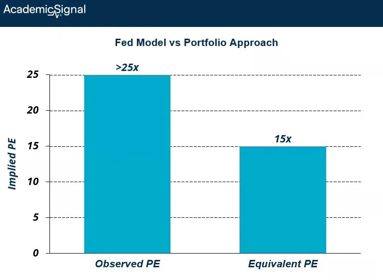 The approach suggests US equities are more attractive than the Fed model indicates - equivalent PE of ~15x vs. observed PE >25x