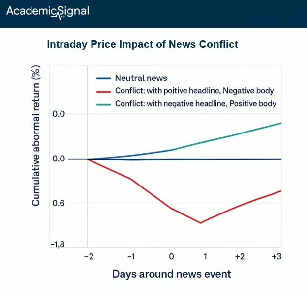 At 10:00 am a tech company gets an article with this headline: “Strong user growth points to bright outlook.” But the body mentions that churn spiked and customer support costs jumped. That is conflict: positive headline, negative body. In the data, those days tend to see the stock drop.