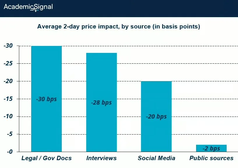 Specifically: +1 legal document linked to about -30bps over 2 days. +1 interview source linked to about -28bps over 2 days and roughly -48.5bps over a month.