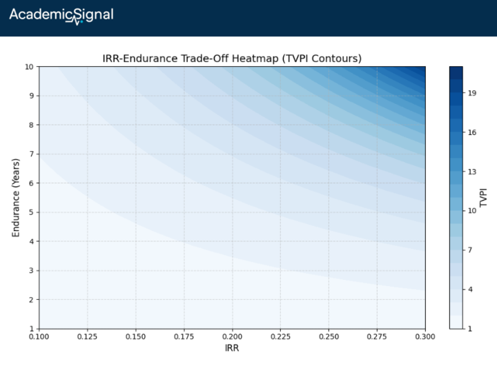 Two funds can deliver identical TVPI through completely different paths: one with high IRR/short endurance (fast money, quick exits), another with lower IRR/long endurance (steady compounding). The liquidity and reinvestment implications are night and day.